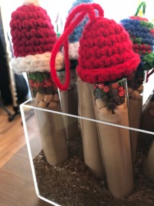 I made a hot chocolate mix, with mini marshmallows, chocolate chips and holiday sprinkles. Then I topped then with a little hat, that you can use as an ornament when the chocolate is all consumed.