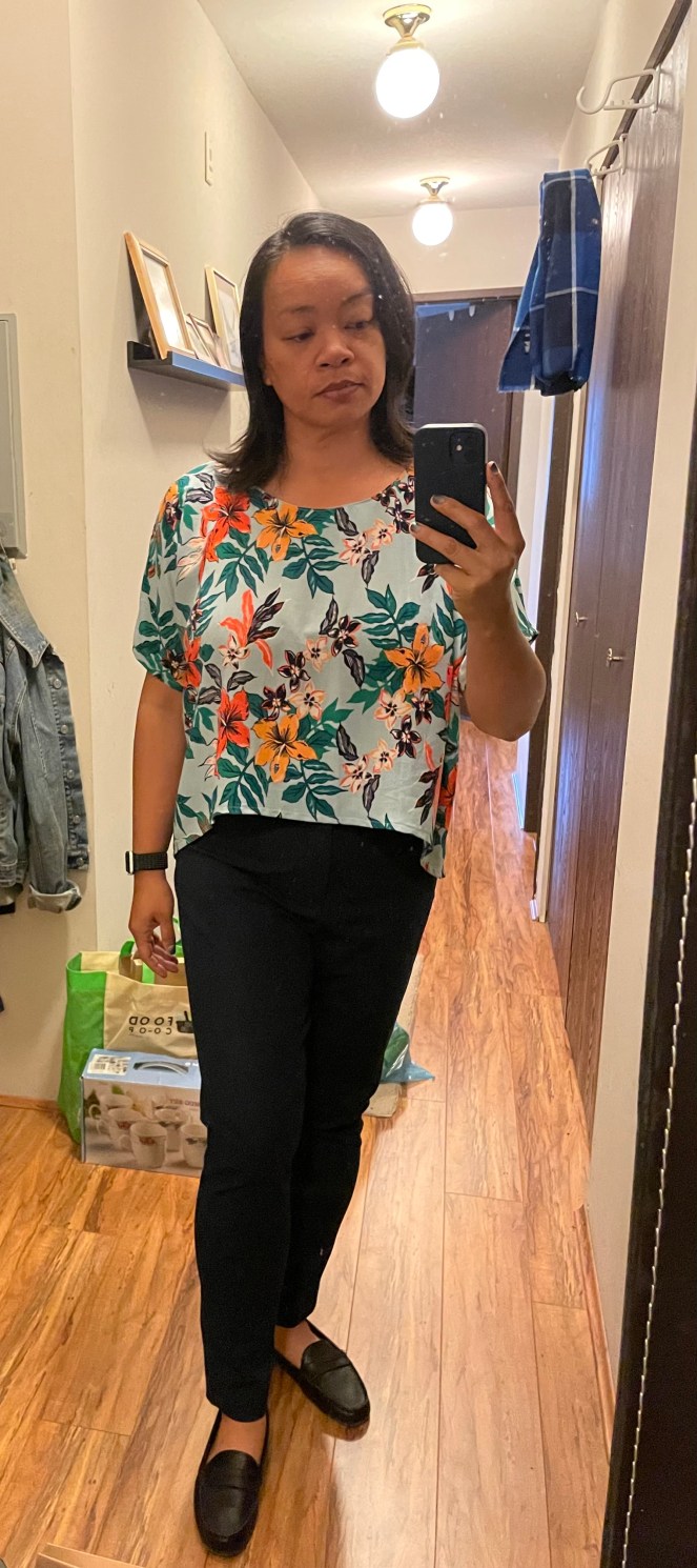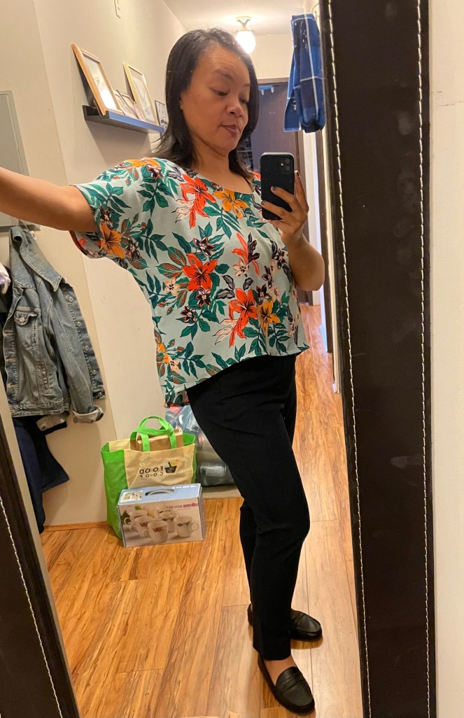 I was on the hunt for a comfy, summery, crop top that wasn’t TOO croppy. I found this pattern on Peppermint Magazine for a loungewear set. I had the fabric in my stash for a year or two, I think I got it from Rokko Sarees. I just love the tropical pattern print.