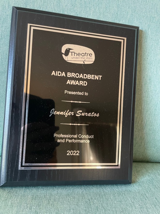 And finally, look at this! TUTS gives out a few awards every year, and I won the Aida Broadbent Award! What a surprise and an honour. I pride myself on giving a professional and consistent performance. And it was a joy to be around many young people, many who were new to the company, where I have spent so many summers. Thank you TUTS, for another unforgettable summer!