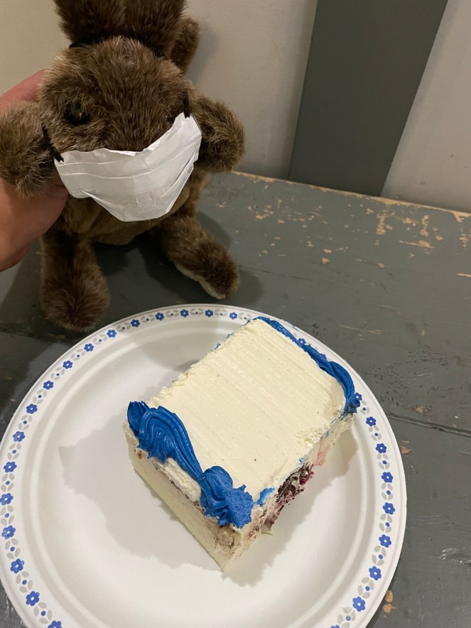 I have done a few shows with Align in the past, and we kick off the first day of rehearsals with a nice, yummy cake. I’m playing the Sour Kangaroo, and my little baby ‘roo is a puppet that we named Russell. He has his own face mask, which he removed to enjoy some cake.