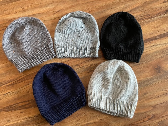 I have been making this knit hat for years and years. It’s a pattern I’ve had in my head and tweaked over the years. I can knit while I read, so I prop my book up and knit in the round, and then I have, well, many, MANY hats. I do them up over the year and then sell them at craft fairs, or give them away.