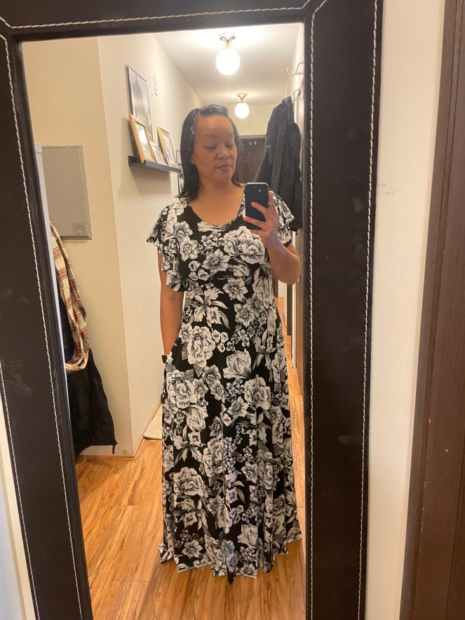 The first one is in a nice, knit, black and white floral. I included pockets on this one! I will have to wait many months to wear it, but I love it. I got the fabric from Fabricland.