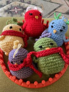I crocheted a few birdies for the Bird Girls in our show. There are five of them all together, and I used colours that match their outfits. They were all thrilled! Such cute little birdies.