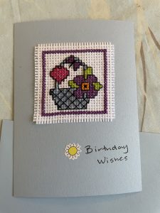 I think the best thing about cross stitching is that you can make small designs that stitch up very quick. I like a nice, quick project. I made a little basket for the front of a birthday card. And I’m making three small plant designs that I will hang up in my bathroom.
