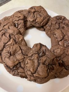 On this hump day, may I present to you: a ring o’ cookies! We made these from a box mix and added LOTS of chocolate chips. Really quick and easy. And yummy.