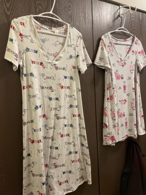 A while ago, I bought some soft and cozy fabric from Fabricland. I wanted to make myself some pjs, and I decided to use the FREE Laundry Day Tee pattern, by Love Notions. I practiced my V-neck sewing, which is tricky. One is a longer shirt and one is a dress – both perfect for PJs.